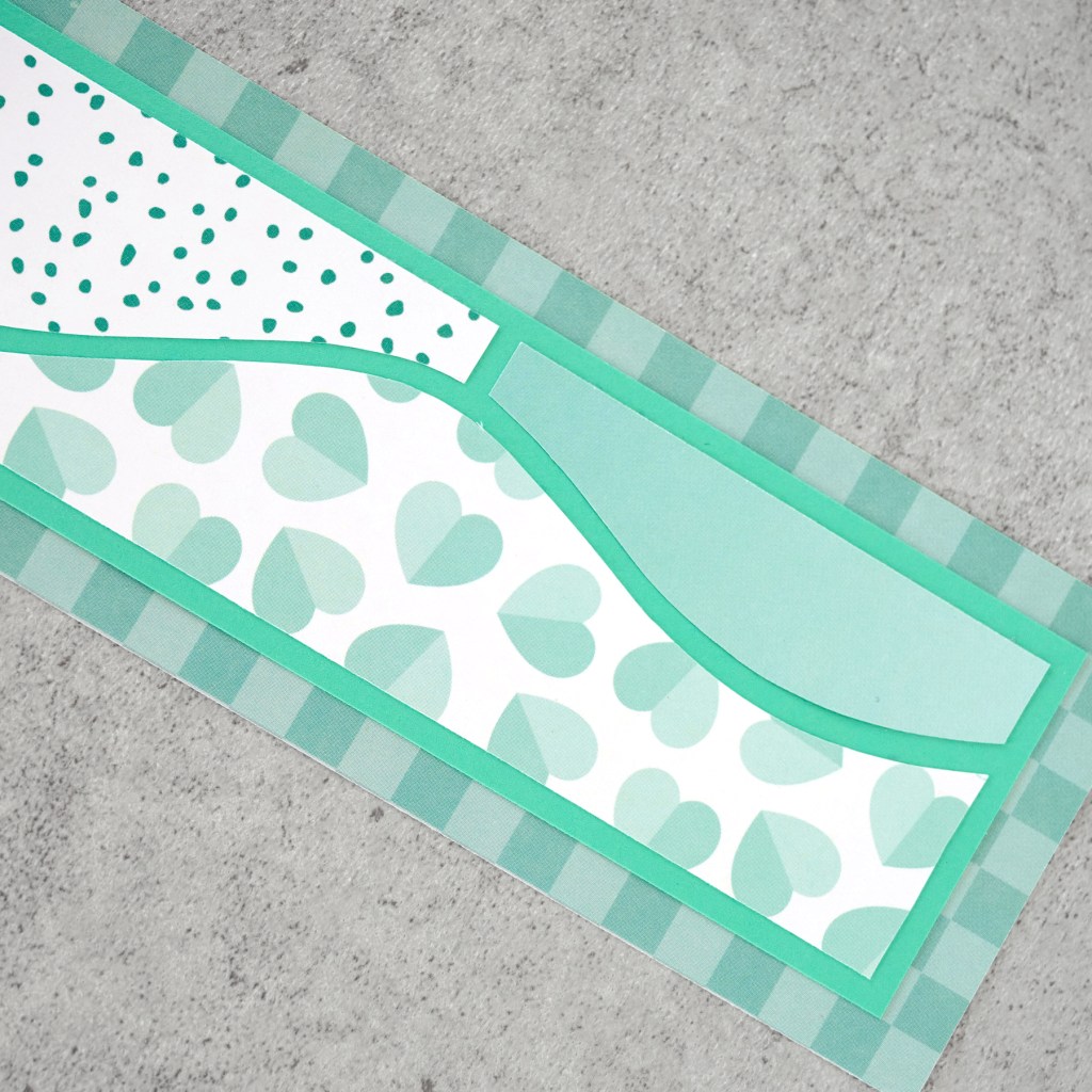 Step 2: Using the Borders & Cards Recipe Template, trace and cut diagonal wavy pieces with island waters and purple ice polka dot papers. Adhere on the card as shown.