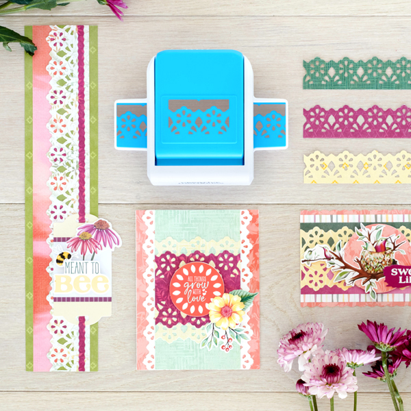 Step 2: Using the Floral Peaks Border Punch, punch a border with ombré spring leaves designer paper. Trim to 1-1/2” x 12″. Cut several 1” squares with olive green diamonds tonal paper scraps. Cut them from corner to corner to create triangles. Adhere behind the “leafy” punch outs of the border. Using the inside of the smallest Circle Custom Cutting System Pattern and the Blue Blade, cut several circles with violet and coral paper scraps. Adhere behind the flower punch outs of the border, alternating hues. Adhere piece on the right side of the border.