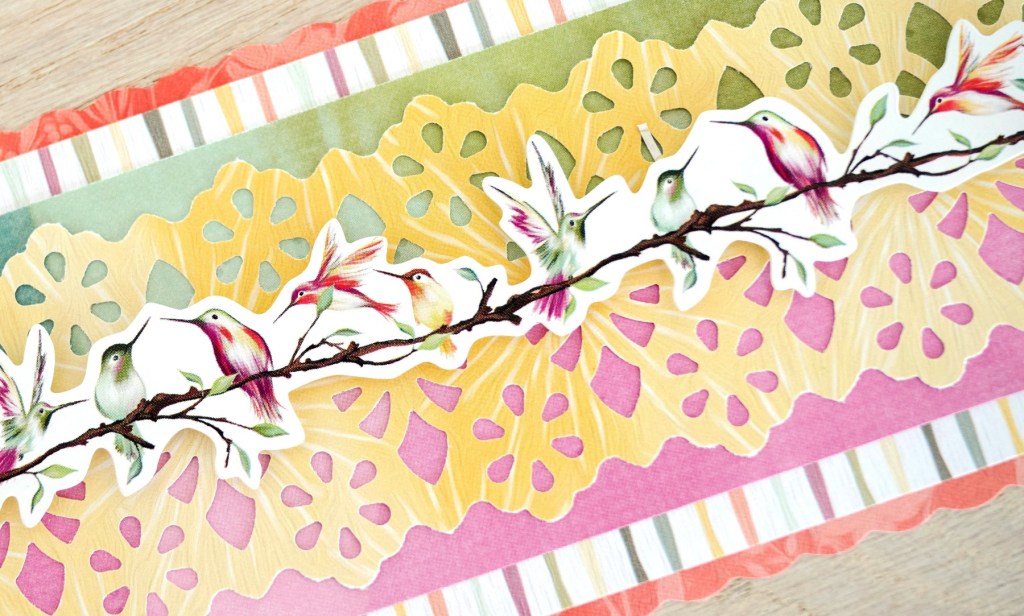 Spring scrapbooking border with hummingbird stickers and floral-patterned cutouts.