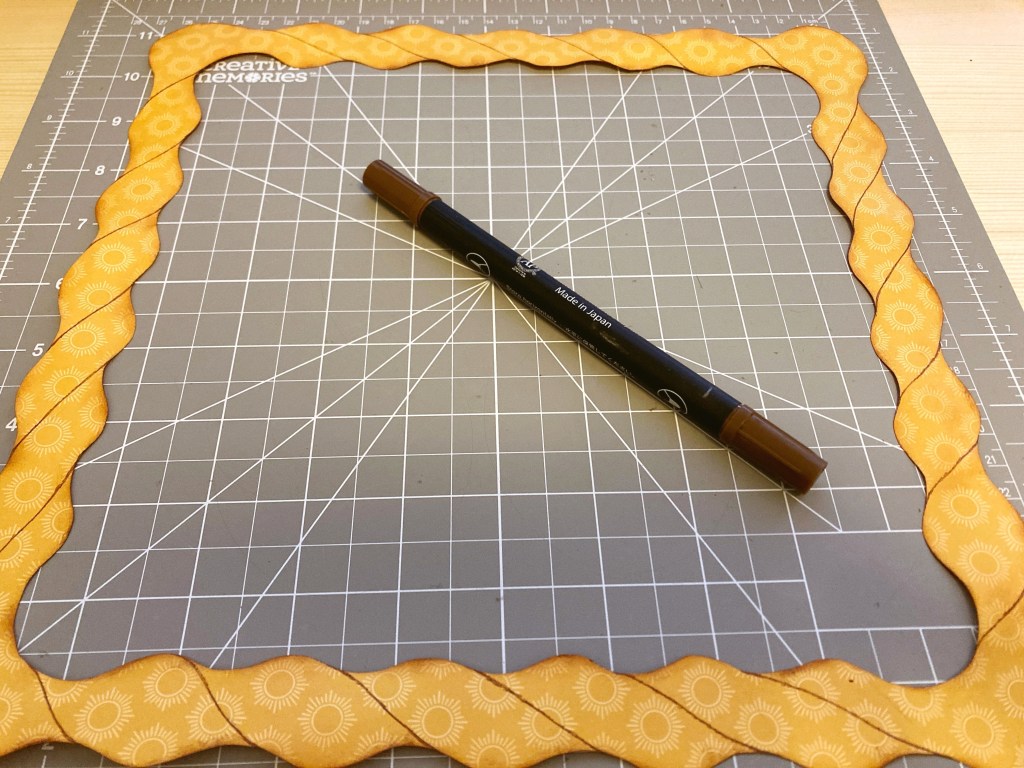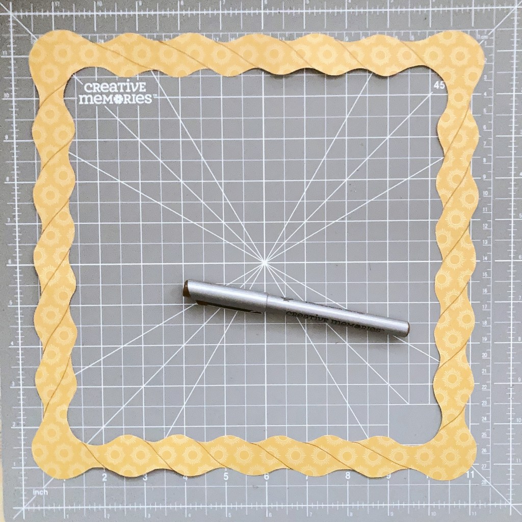 Step 2: Use the Photo Labeling Pencil to trace the outer frame of the Tropic Time Recipe Template on the mustard sun tiles designer paper. Cut out the traced piece.