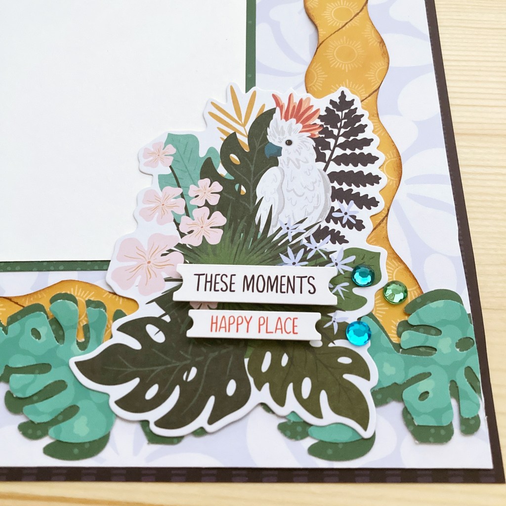 Step 4: Use the Monstera Leaves Border Punch to punch two borders from the dark green mini triangles and one border from island water mini florals paper. Adhere the island waters border slightly offset from the dark green borders as shown. Add to the page.