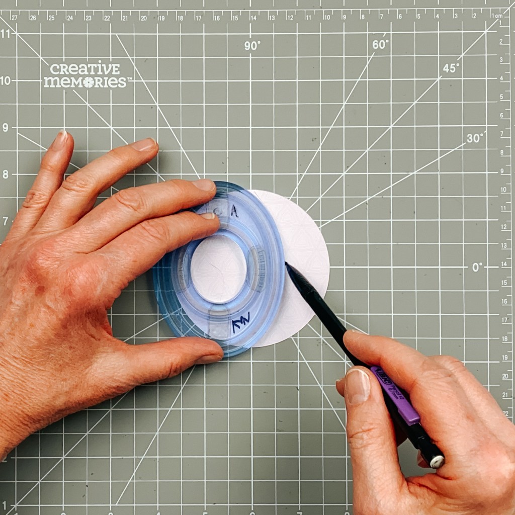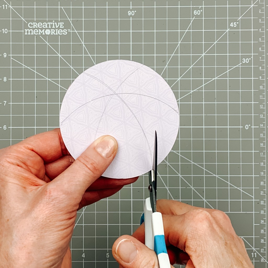 Step 4: Create three “beach balls.” Using the inside edge of the largest Circle Custom Cutting System Pattern and the Red Blade, cut three circles with white sand dots paper. Cut one circle each with coral suns, dark sea green summer icons and phrases and purple ice wavy tiles papers. Stack the three papers and place on the middle of the 13×30 Custom Cutting System Mat. Place the smallest Oval Custom Cutting System Pattern on top so that the oval’s right edge meets the two vertical lines on the mat. Trace the arc with a pencil. Place the second-smallest Oval Custom Cutting System Pattern on the circle so that the oval’s top edge meets the 30-degree lines as shown. Trace the arc with a pencil. Place the same oval pattern on the circle so that the oval’s bottom edge meets the other two 30-degree lines as shown. Trace the arc with a pencil. Keeping the circles stacked, cut apart at the lines. Apply Repositionable Tape Runner to the pieces and adhere to the white sand dots circles, alternating hue, as shown. Using a hole punch, punch three small circles from a part of a paper with a light aqua hue (e.g., skies or water waves papers). Adhere to the “middle” of the beach balls. Adhere the beach balls to the layouts as shown.