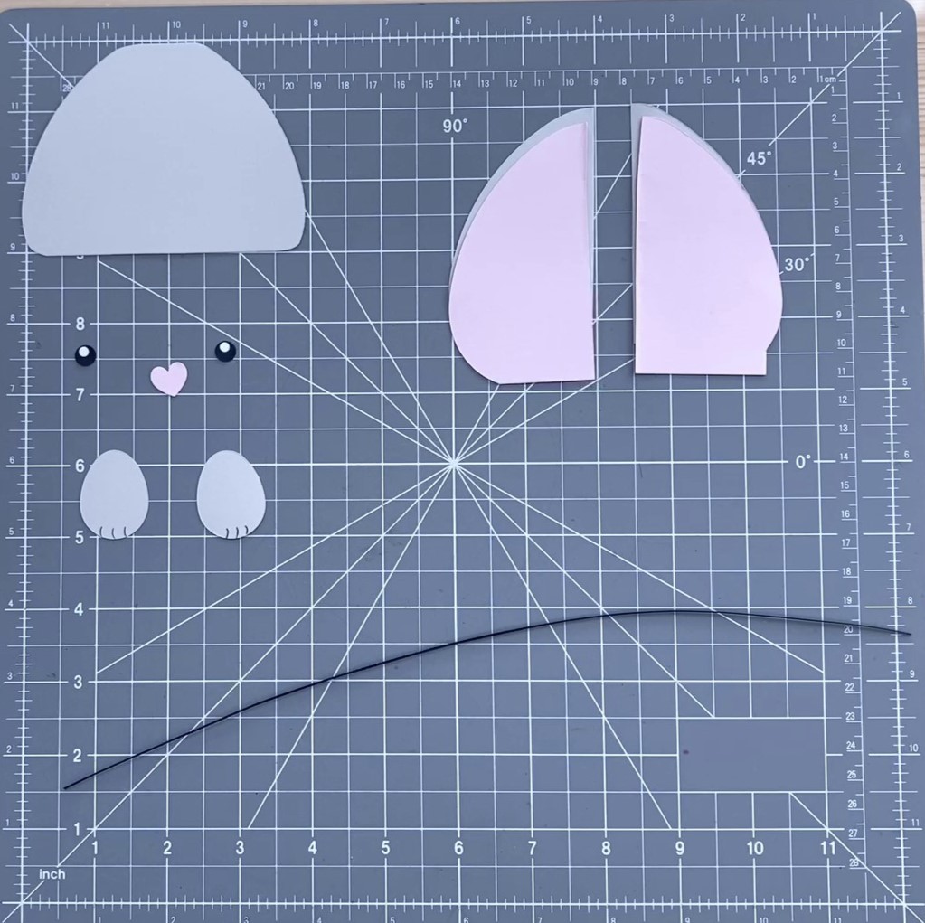 • Use the outside of the small heart Gemstone Custom Cutting System Pattern and the Red Blade to cut a piece of heart from Beige Solid Cardstock and Soft Pink Solid Cardstock. Cut both heart shapes in half. Add the pink piece slightly offset from the beige one to make it look like ears.