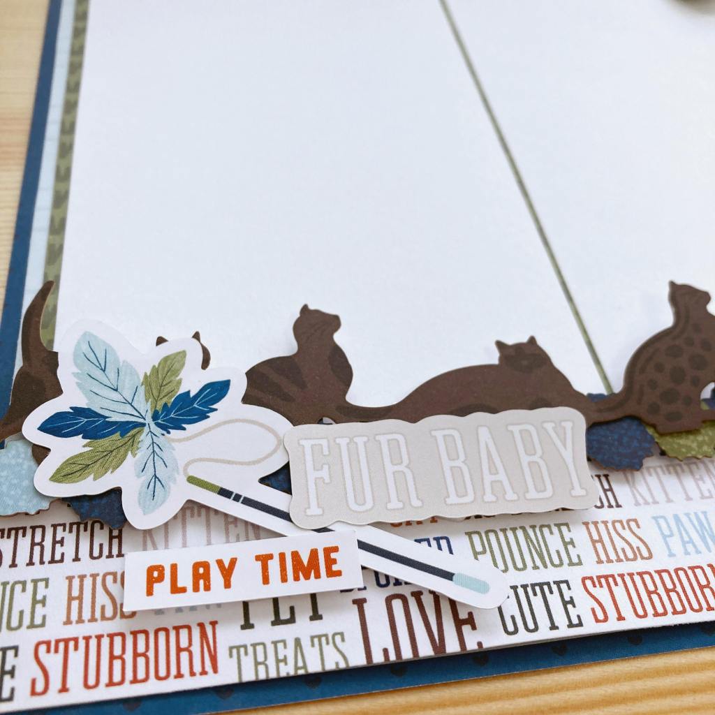 1. You could personalize the page by creating the cat out of color cardstock that is similar or reminds you of cat you’re highlighting. I had a variety of cats in childhood and some paper color designs I might look for in paper stash: white and black like a ? cow pattern, small tiny print paper with orange and white for cat we named Orange Marmalade Cookie, a multicolor tiny print paper with browns, whites, and black for 2 cats we had with those colors… Maybe if you had a cat that had a wild streak, could find/use paper that reminds you of Wild Cat Cousins.