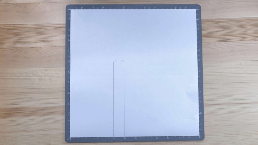 Step 2: Draw a 7” vertical line from the bottom of White Solid Cardstock at 4” and 5” from the left-hand side as shown. Align the inside edge of the smallest Circle Custom Cutting System Pattern to the end of both lines and draw curved line.