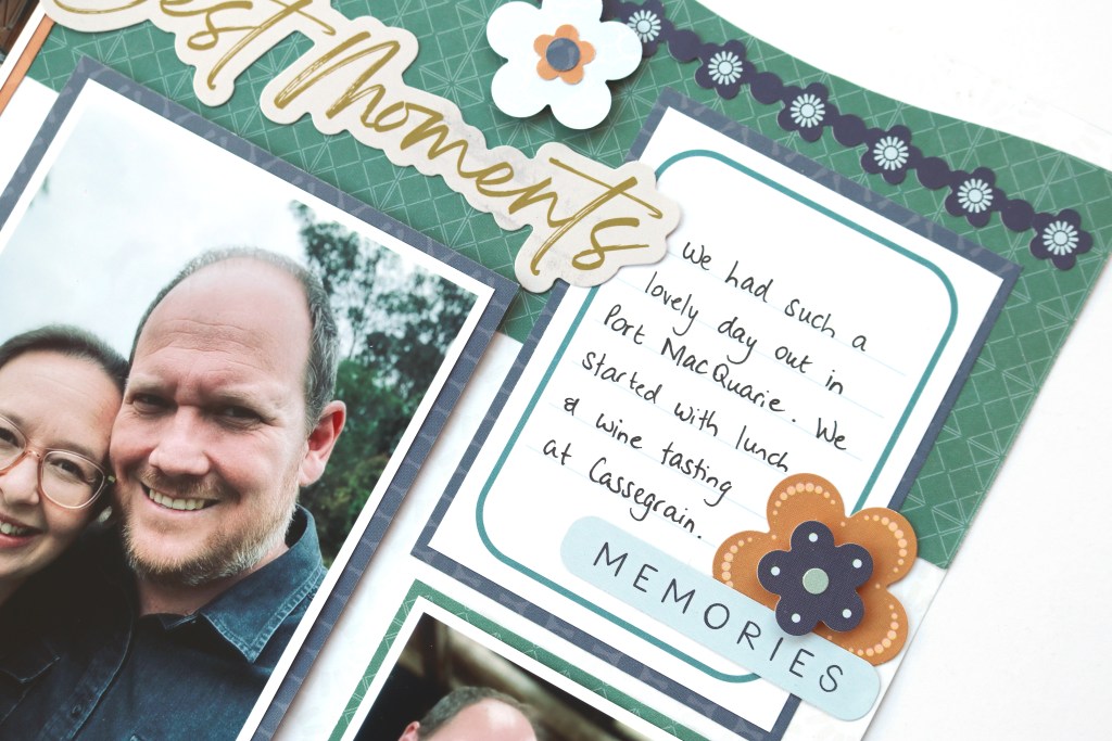 Mandy’s Tip: “When using a sketch as a guide, don’t feel limited by the orientation of the photos in the sketch. This sketch shows five vertical photos, however, I didn’t have that many vertical photos to use on this layout. I instead used three square photos down the left-hand side and I switched one of the photos on the right for a journalling spot. I still managed to fit five photos on the page, but made the sketch work for the photos that I had.”