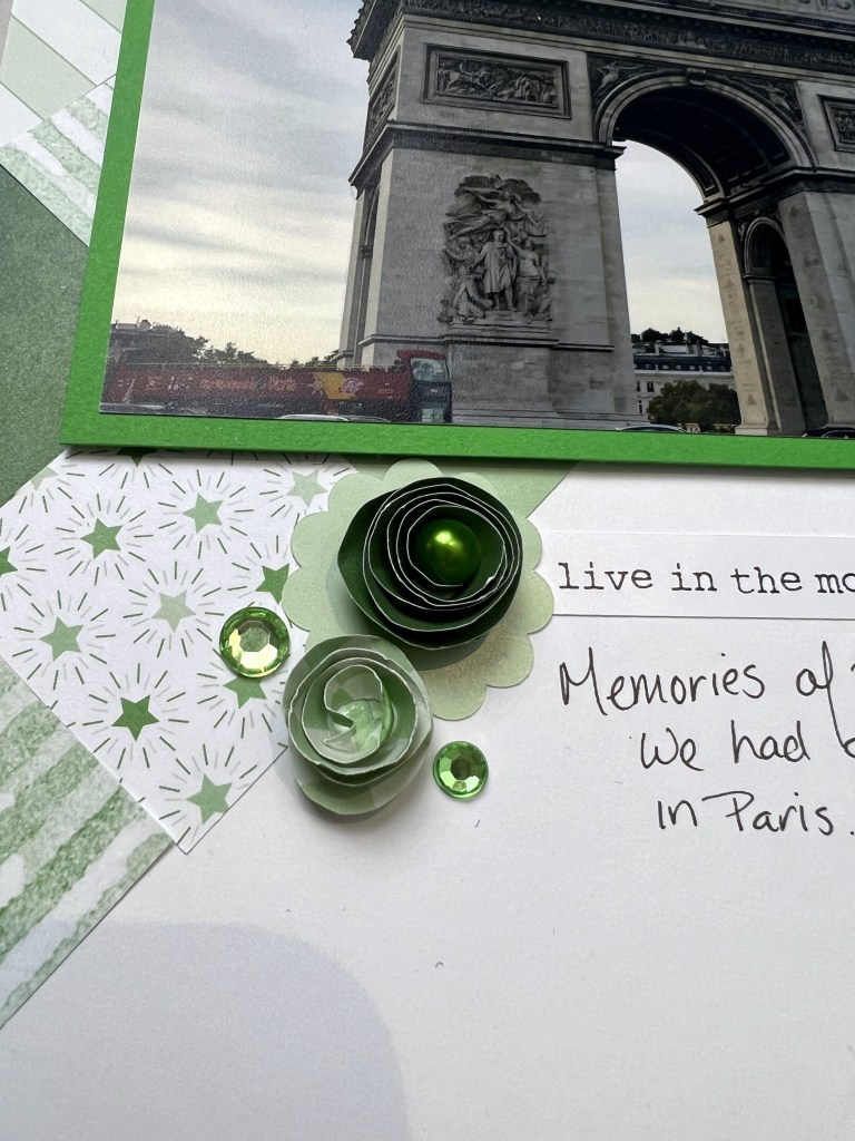 - “Cluster embellishments look better in odd numbers and different heights. I made the little rosettes by cutting a circle then cutting the circle into a ‘cattail’ and rolling it up. Add a drop of glue to hold it all together and you have a cute little flower. Don’t forget to add a little bit of sparkle to your page with a few gems or pearls.”