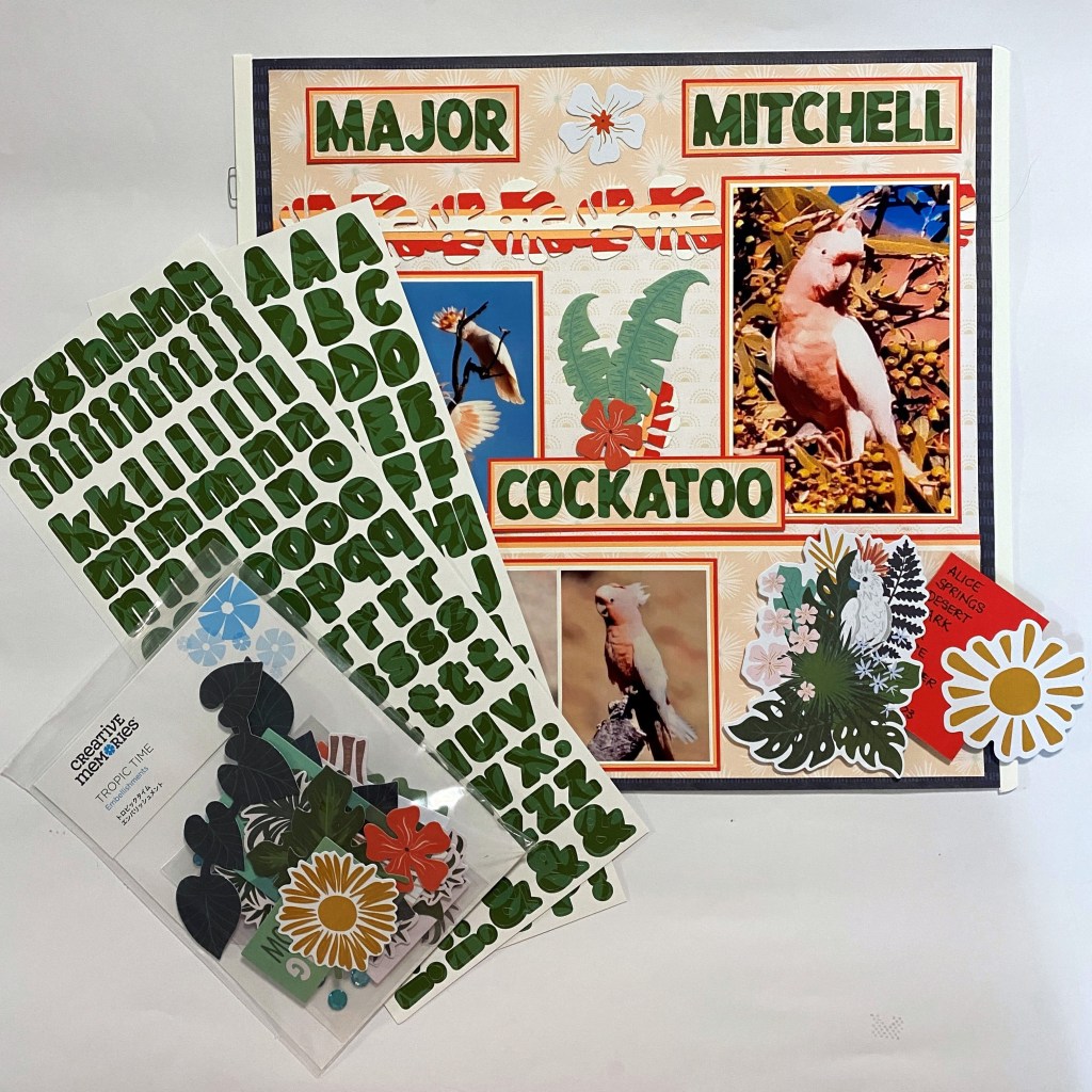 Maggie’s Tip: “Don’t be afraid to change the colours of a typical punch to suit your layout and hide your journal notelet to make more space. I layered the colours of the punch to match the cockatoo’s feathers and mounted the embellishment on Foam Tape to allow for a pull-out journal notelet.”
