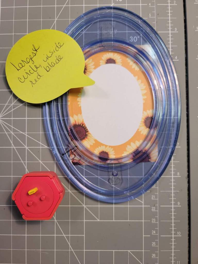 - “To create the sunflower background paper edges, I used the Mandala Burst Border Punch (a personal favorite). I marked the paper at 6″ on each side of 12×12 paper to make the first punch. Flipping punch over to see the ‘undercarriage’ for those first punches, one on each edge in the center of the paper’s edge. Then flip the punch back, right side up, to do the next two punches on either side of the first punch. Don’t punch the corners yet! Next, fold each corner at 1-1/2″ diagonally, using our Cutting Mat. Flip over the punch again (undercarriage), carefully center the folded corner into the punch and punch the paper four times — once at each corner.”