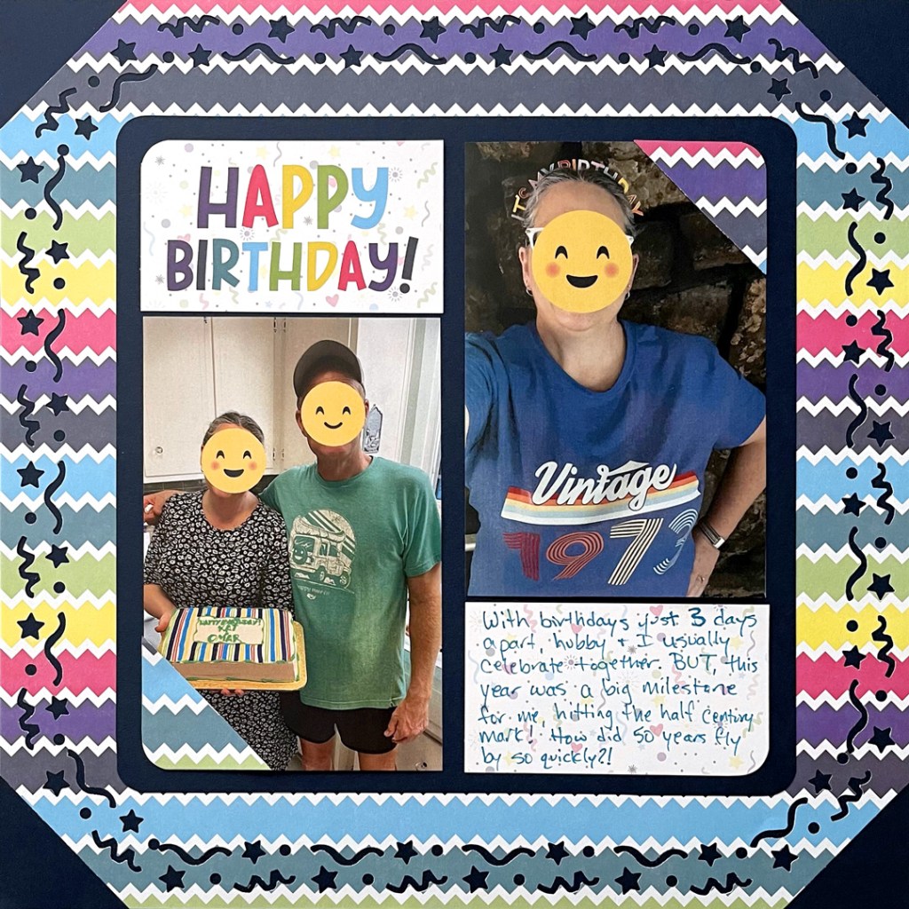 - “I love the bright stripes, but it is a busy layout! The Navy Cardstock tones it down a bit from the top and is strong enough to show through the design left by the Confetti Border Maker Cartridge.”