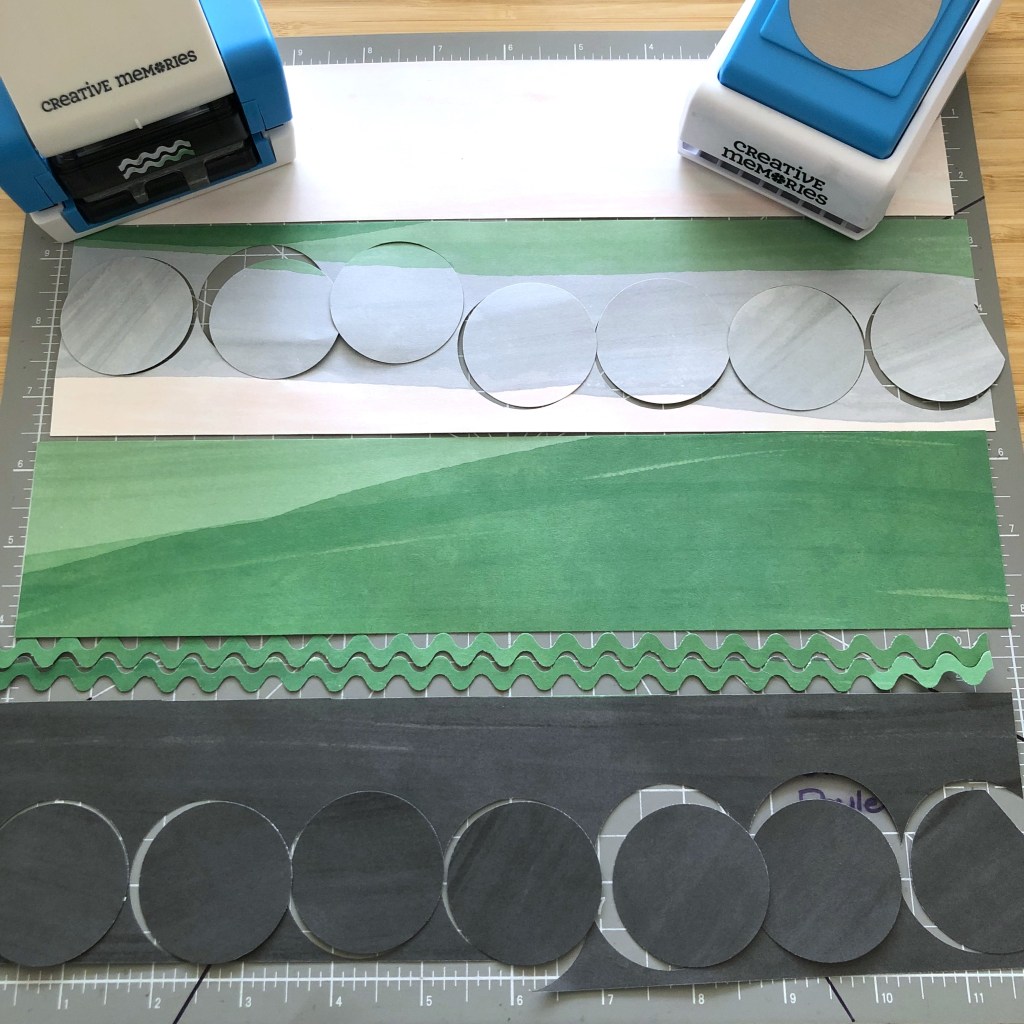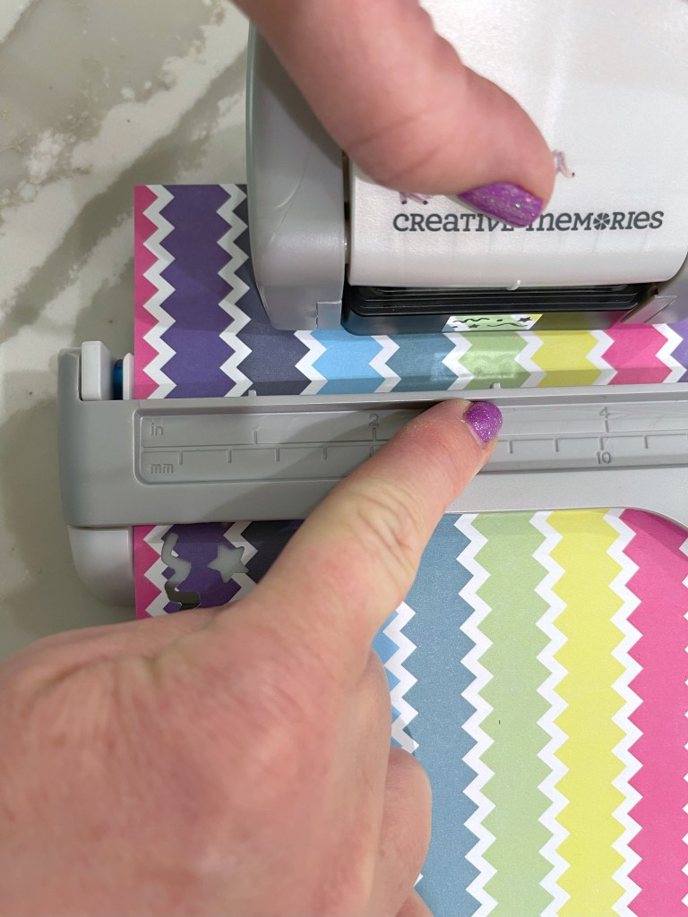- “I used the Confetti Border Maker Cartridge to create the design on the striped paper. To recreate it, you’ll want to punch along each side of the paper, skipping the first and last positions on the guide. Next, cut the corners off the page using the 45-degree angle on the 12-inch Trimmer and lining up the corner at the 1-1/4” line. Save these triangles to use as accents on your photos! Turn the paper upside down and lay it on the edge of a table for stability. Turn the BMC housing upside down and punch each corner. Make sure the flat side of the trimmed corner is all the way against the back of the cartridge and that there are no previous punches/holes showing through the window on the bottom of the cartridge.”