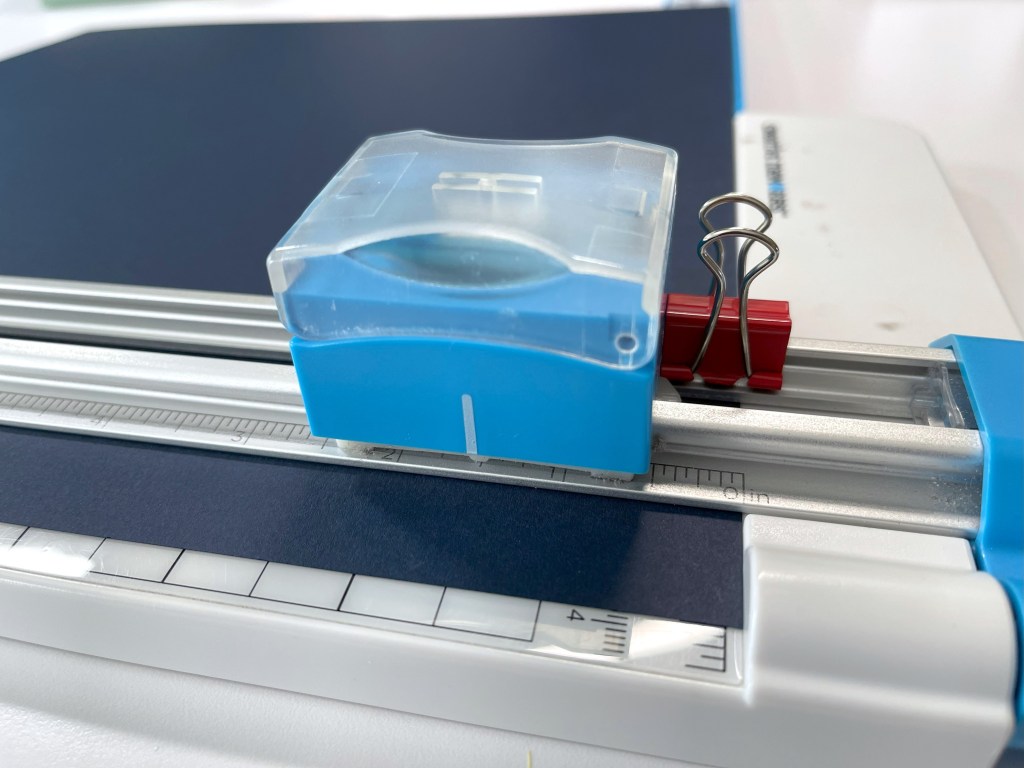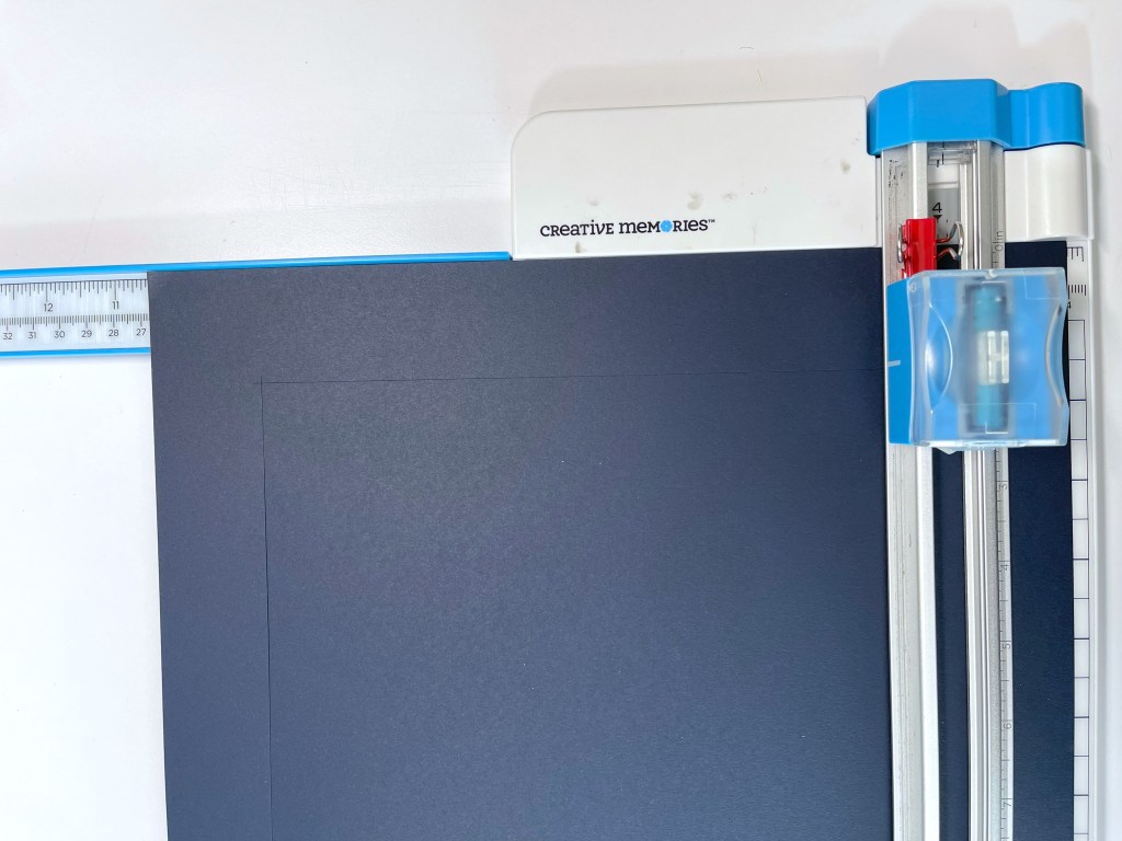 - “To save paper, I cut a 9″ x 9″ square from the Navy Cardstock base to use on top of the stripes paper. In making this, it’s easier for me to think of it as a 1-1/2” frame. Use binder clips on the 12-inch Trimmer to make sure you don’t cut too far. Line the cartridge up so the white line is pointing at 1-1/2” and put the binder clip above it to act as a stop. Line it up again at 10-1/2” and put another binder clip below it. Line the cardstock up on the trimmer arm at 10-1/2”, then make a cut from one binder clip to the other. Turn the cardstock and make the same cut on all four sides. To assemble, layer the frame, stripes paper, then 9” square.”
