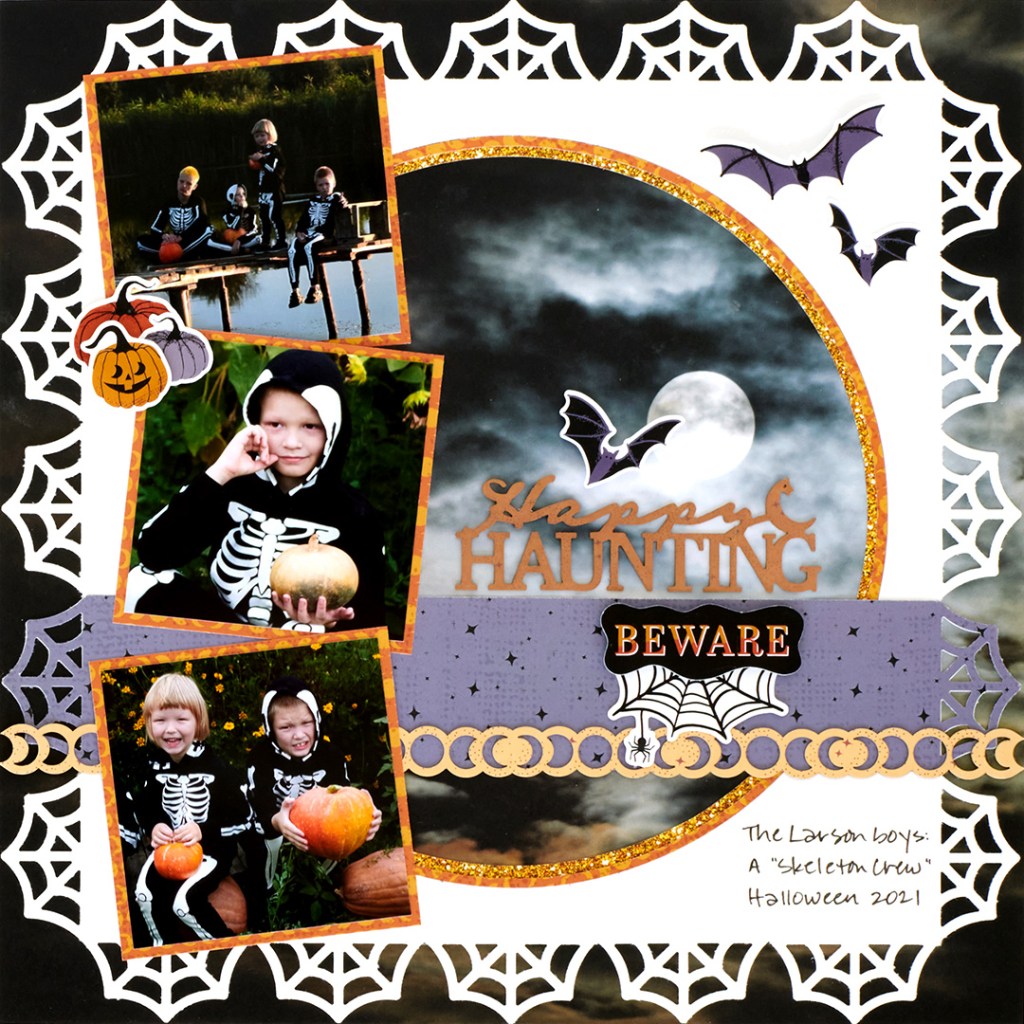 - You could use a paper with a hauntingly cool moon design, a spiderweb embellishment, a Halloween-themed BMC or punch, a photo of carving pumpkins or the kiddos trick-or-treating; ANYTHING Halloween-related is fair game!