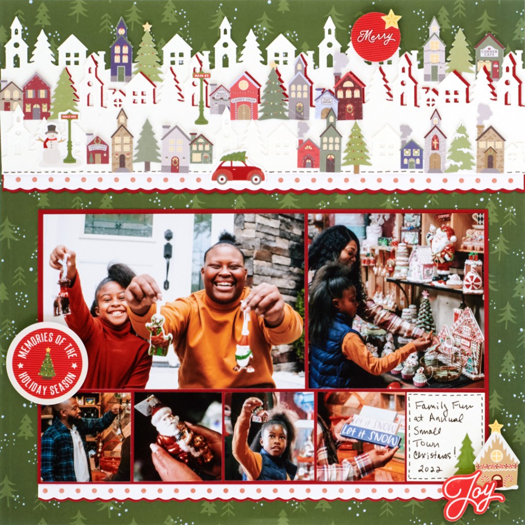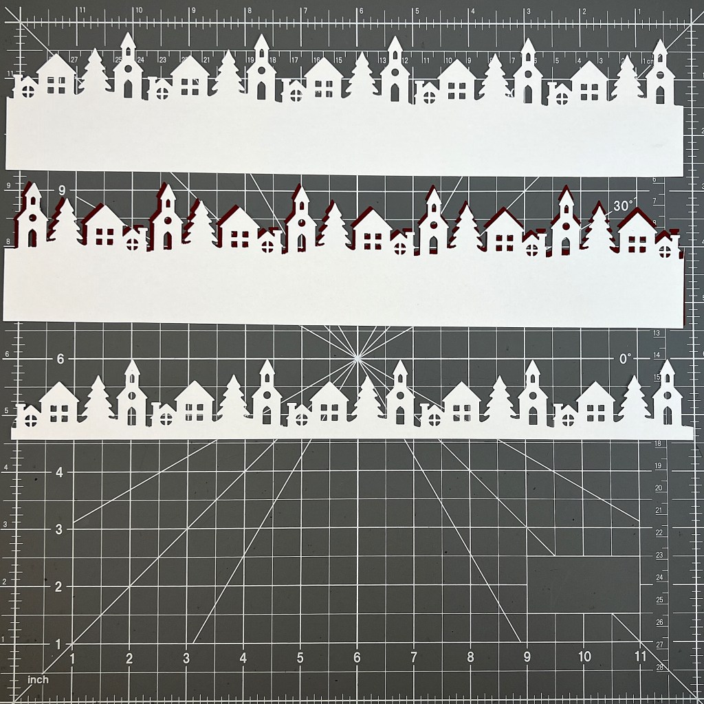 Step 4: Use the 12-inch Trimmer and the Scallop Blade to cut 12” x 3/4” strips from White and Cranberry Solid Cardstocks. Layer and adhere the white piece to the cranberry piece. Adhere the layered piece underneath the village border.
