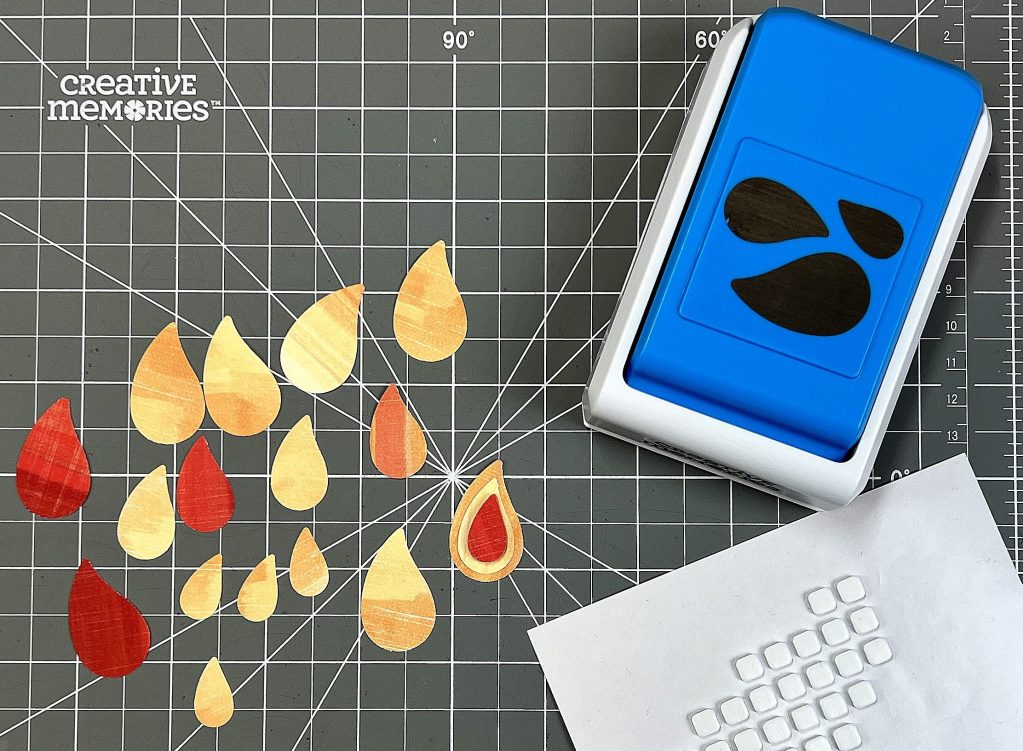 Step 4: Use the Flames & Drops Punch to punch flames from a variety of papers. Adhere flames to the tops of the candles and to the title embellishment. Layer some of the flames and adhere some of the flames with Foam Squares for added dimension.