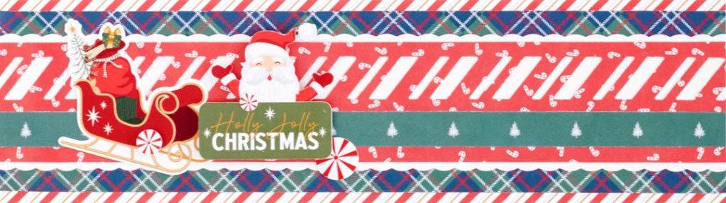 Step 1: Cut a 12” x 3-1/2” strip with candy cane stripes designer paper for the base. Cut a 12” x 3” strip with blue, green and red plaid accessory paper and adhere on the base.