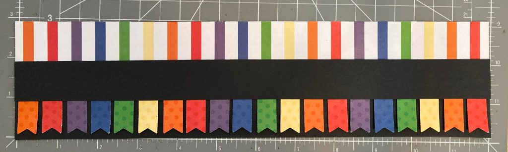 Step 3: Cut a piece of Black Solid Cardstock to 12? x 1? and adhere along the bottom edge of the stripes patterned paper as shown.