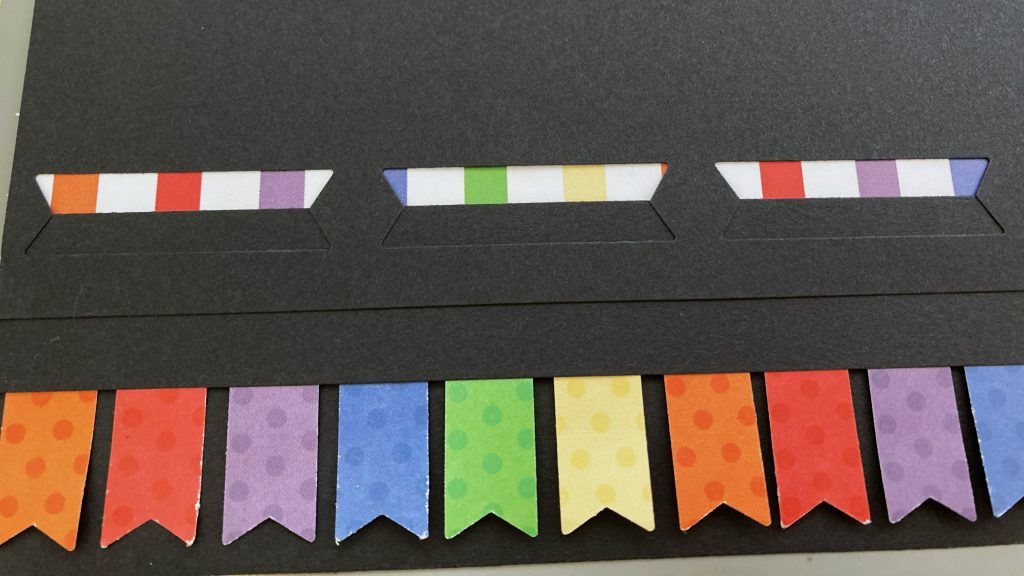 Step 2: Use the Original Border Maker System and the Banner Border Maker Cartridge to punch out 20 banner shapes from 6 different colored tonal papers. Adhere the banner shapes to the stripes paper using the pencil line as the guide as shown above.