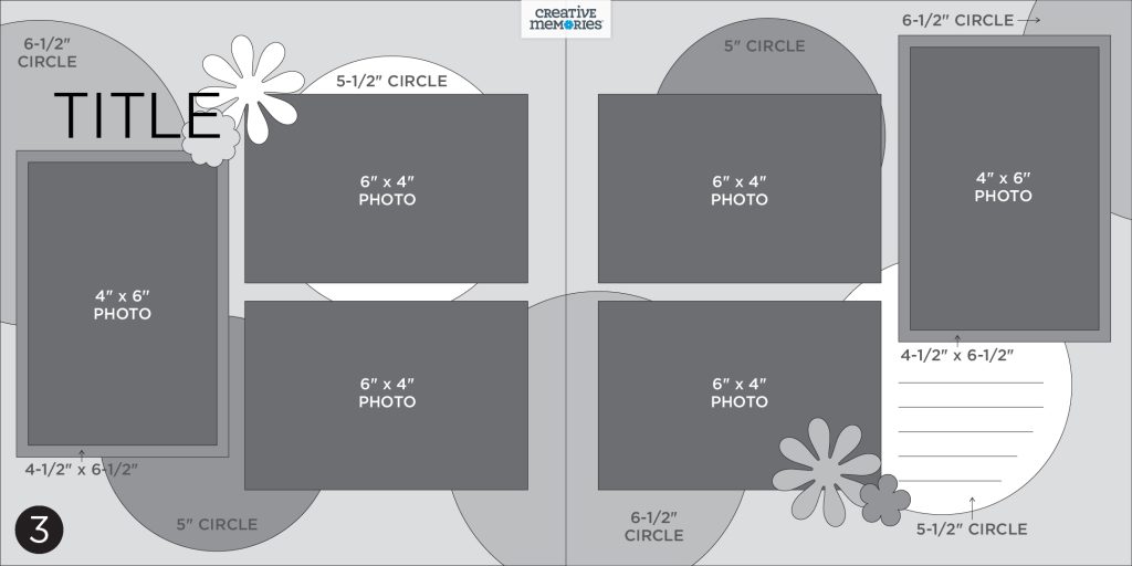 Nicole’s Tip: “When you’re cutting out your large 6-1/2″ circles, just cut two. Adhere down the first circle on the left page and trim off the excess — use that excess paper in the upper-right corner on the right page!”