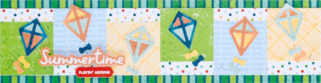 Step 1: Cut a 12? x 3? strip with strokes paper for the base. Cut a 12? x 2-1/2? strip with dots paper and adhere on the base. Cut six 2? squares with cool tonal colorblock, good times and ice cream cone papers. Adhere on the border as shown.