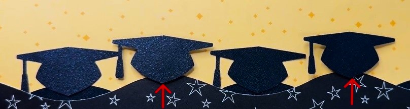 Step 3: Use the Cap & Diploma Punch to punch four graduation caps from a piece of Black Shimmer Solid Core Paper. Add to the base using Foam Squares on two of the caps marked with a red arrow in the image above for added dimension.