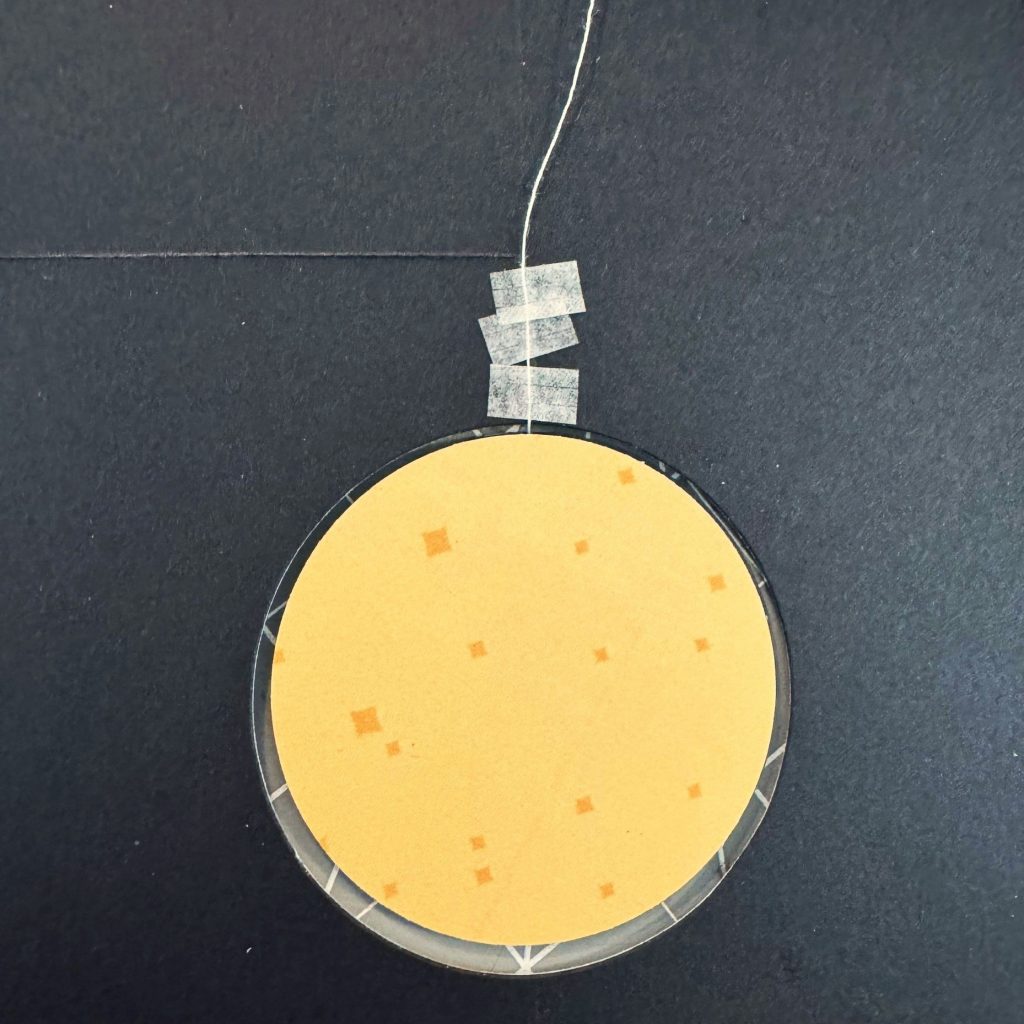 Step 6: Place the swinging piece in the middle of the circle window. Adhere the thread using the Tape Runner. Trim the excess thread as you go. Adhere the 4? x 3? piece to cover.