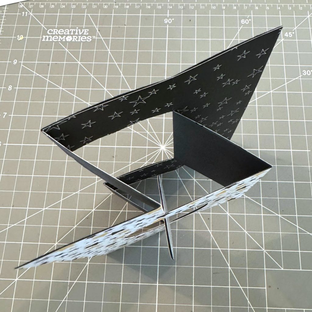 Step 2: Use the 12-inch Decorative Trimmer to cut waves to measure 12? x 1-1/4? from black stars paper from the This Life Black & White Paper Pack. Use the 12-inch Decorative Trimmer again to cut waves to measure 12? x 1-1/8? from Black Shimmer Solid Core Paper. Adhere the two borders to the base.