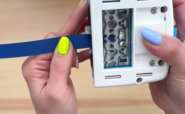 Step 3: Cut two 1/2” strips from a piece of Blue Solid Cardstock. Insert the strips into the BMC housing unit with the Bears Chain Cartridge and punch a heart shape as shown. Punch 32 heart shapes in total. Use Foam Squares to add the heart shapes to the page.