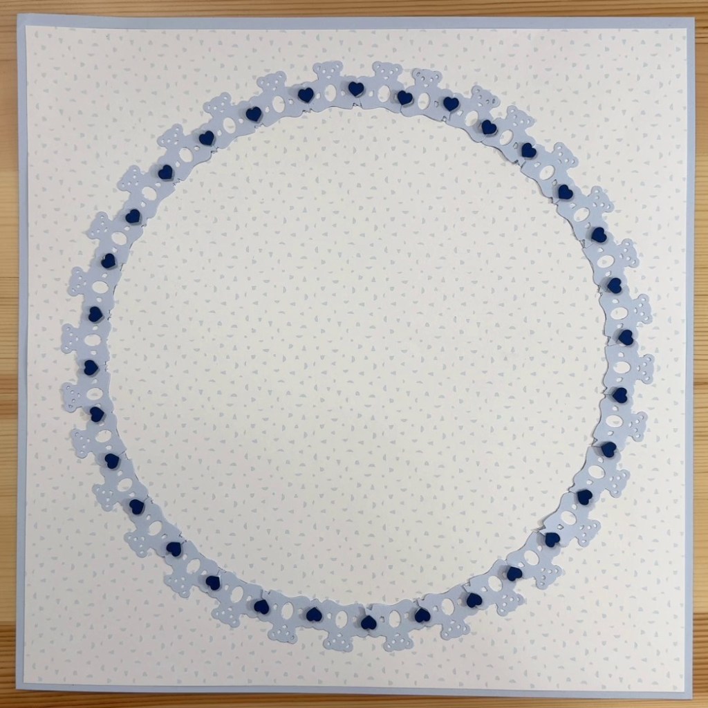 Step 2: Use the Original Border Maker System with the Bears Chain Border Maker Cartridge to punch four borders from the baby blue cutout square piece from Step 1. Cut a slit on the bottom of the heart shape as shown. Bend the border to make it a curved line as shown. Trace the inside edge of the Jumbo Circle Custom Cutting System Pattern onto the scattered bits base with a pencil . Using the pencil line as the