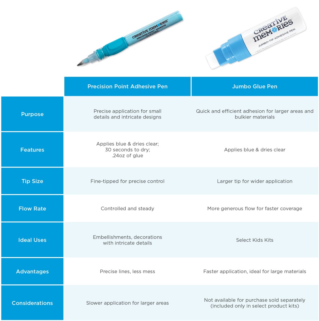 Easily adhere embellishments to your scrapbook layouts with precision with Creative Memories adhesive pens! The Precision Point Adhesive Pen is a standalone product perfect for adhering intricate details to your layouts. The Jumbo Tip Adhesive Pen (currently only included in select Kids Kits; not available sold separately) features a wider marker-style tip for easier grip and application for kids.