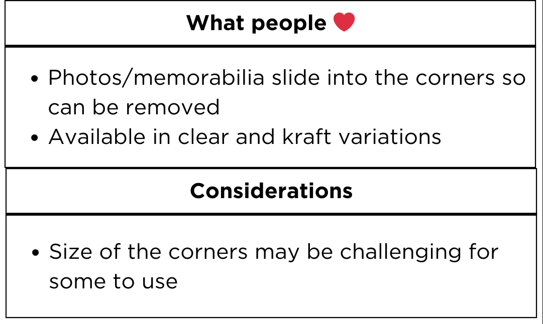• Ability to Add/Remove Keepsakes: Photo Corners adhere to the pages in your album and not directly to the photos or memorabilia, so your keepsakes will stay secure within your album unless you choose to remove them, which you can do without causing any damage to the keepsake.