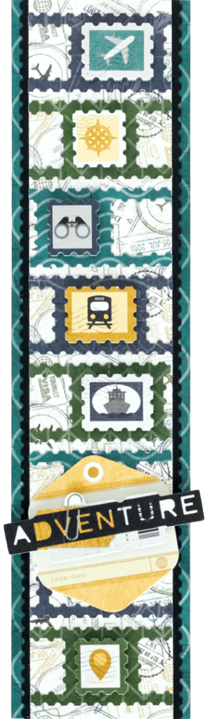 Step 2: Cut a 2-3/8″ x 12″ strip with passport stamps paper. Using the postage stamp border punch, punch a border with black cardstock. Cut the strip in half lengthwise. Adhere halves behind the passport stamps strip so just the edges show and mount on the border.