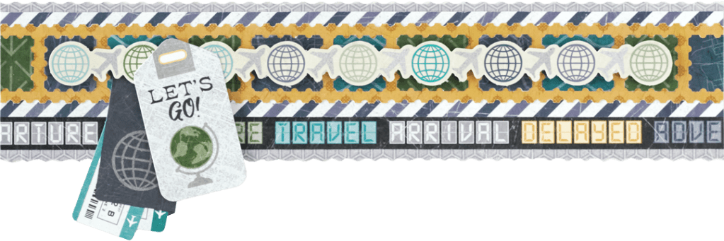 Step 3: Trim a globes border sticker to 10-5/8″ and adhere it on the border using foam squares. Add ticket and title embellishments.