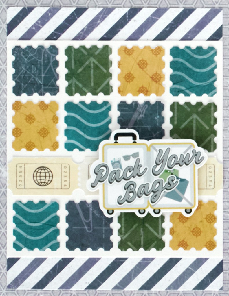 Step 3: Punch postage stamp borders with deep sea green, green and navy designer papers (or use the borders leftover from the Let’s Go border). Trim to 2-3/8″ sections and adhere on the border as shown.