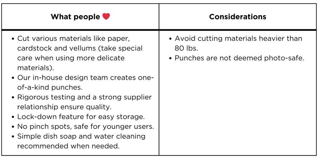 - Uniquely Creative: Our in-house design team creates our line of unique shapes and designs ensuring you’ll find the perfect punches to match your scrapbooking vision.