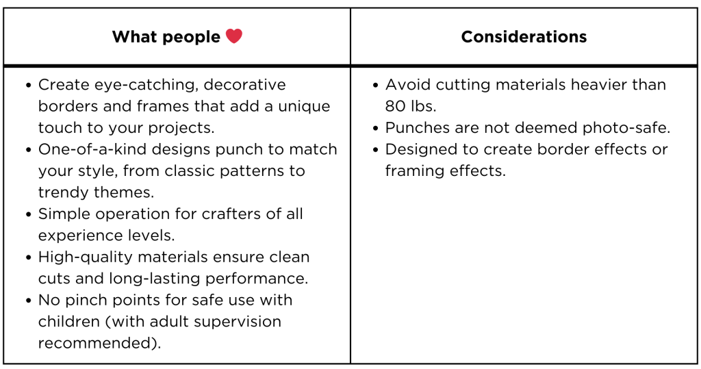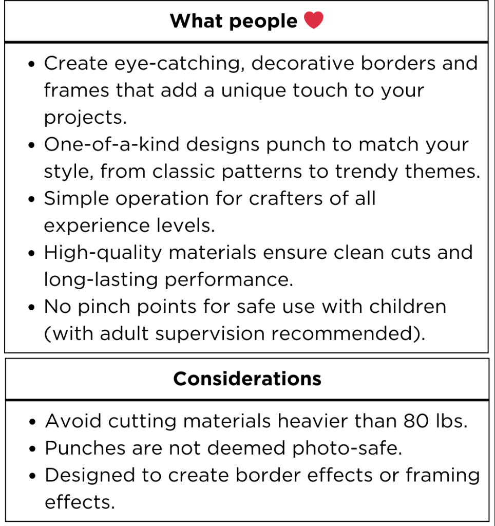 Perfect for: If you’re a crafter who loves to add decorative borders and frames to your projects, these punches are a valuable tool. They allow you to create custom designs, add visual interest and frame your photos and memories in a unique way. Whether you’re a seasoned scrapbooker or just starting out, border and frame punches can elevate your projects and bring your creative vision to life.