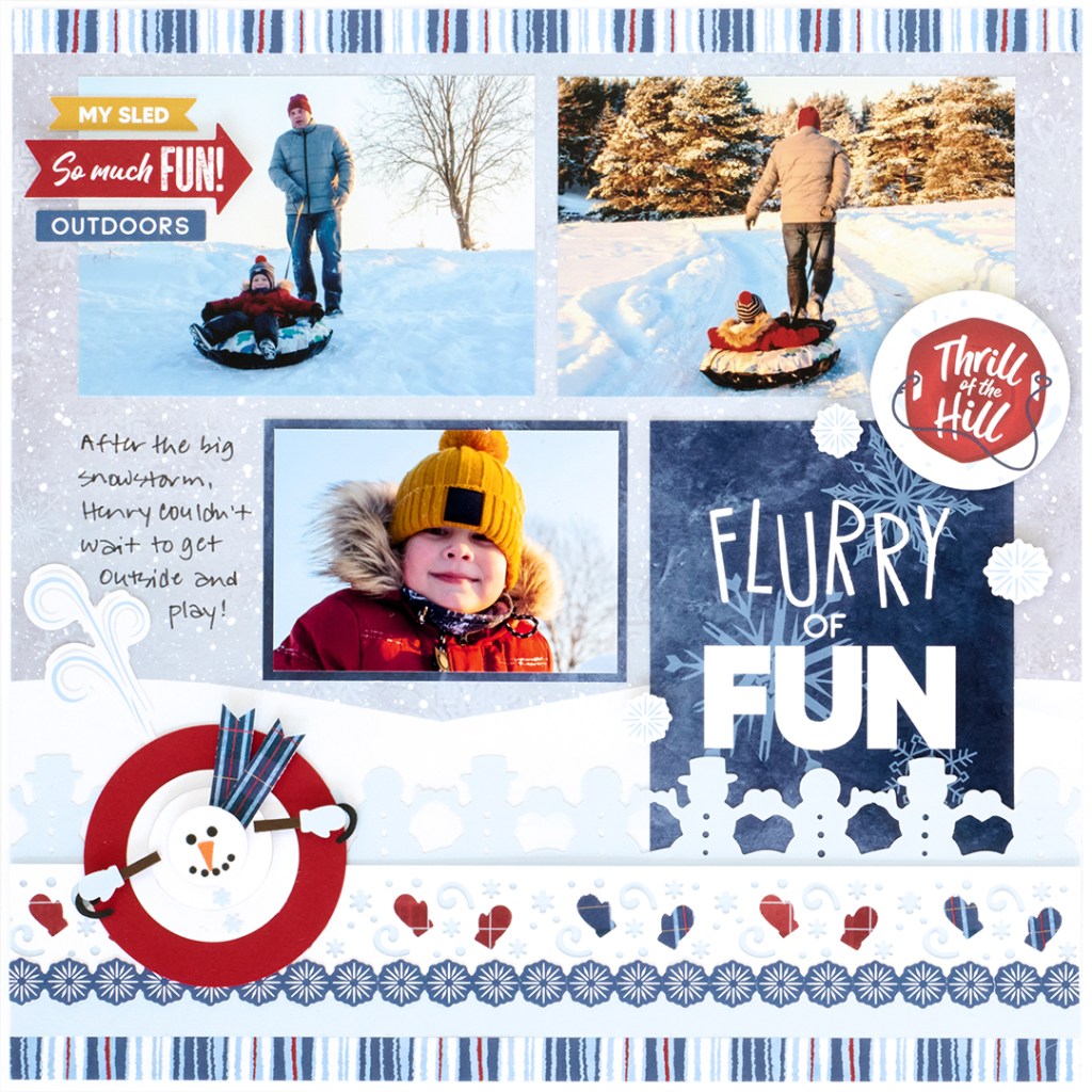 Winter is quickly approaching — and it’s bringing snowfall, sledding and plenty of time for scrapbooking! Record your winter memories easily with this snow-inspired layout created with the Flurry of Fun collection! By using the Custom Cutting System with Circle Patterns, you can make an adorable snow pal, perfect for all cold weather spreads!