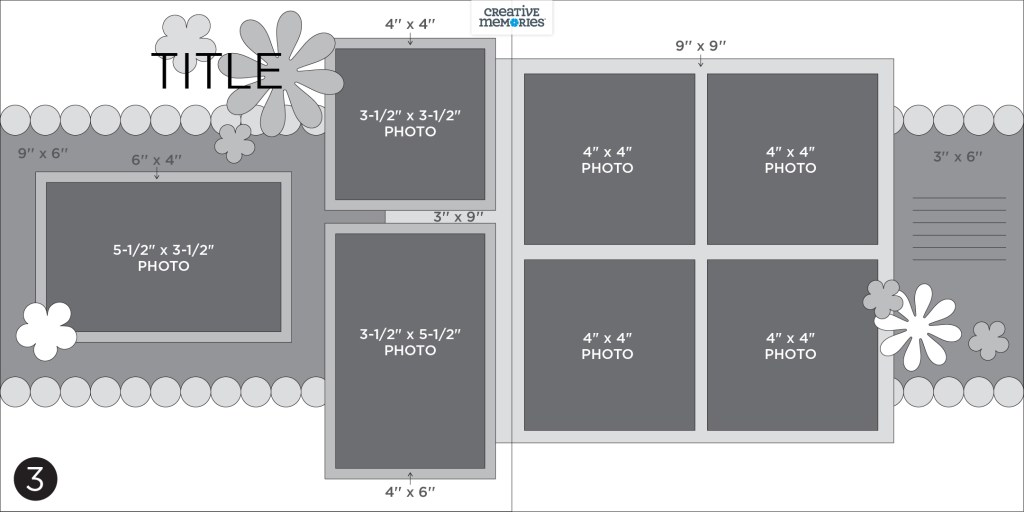 Noreen’s Tip: “When the focus of your layout is mainly in the center of the page as it is in this sketch, create some movement by placing the title cluster and another embellishment cluster opposite each other on a diagonal to draw the viewer’s eye through the layout!”