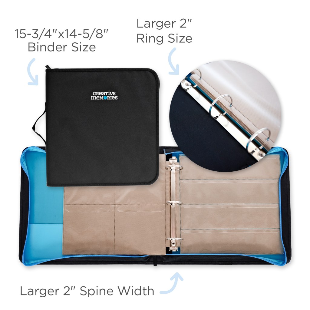 This versatile binder is designed to keep your crafting supplies neat, tidy and easily accessible. With its larger size, bigger rings and spacious interior pocket, you can store more of your favorite scrapbooking essentials. The convenient three-side opening, zip closure and sturdy handle make it the perfect companion for any crafting adventure. Plus, our exclusive Fill & File Sleeves offer customizable storage options for your papers, embellishments, borders and stickers.