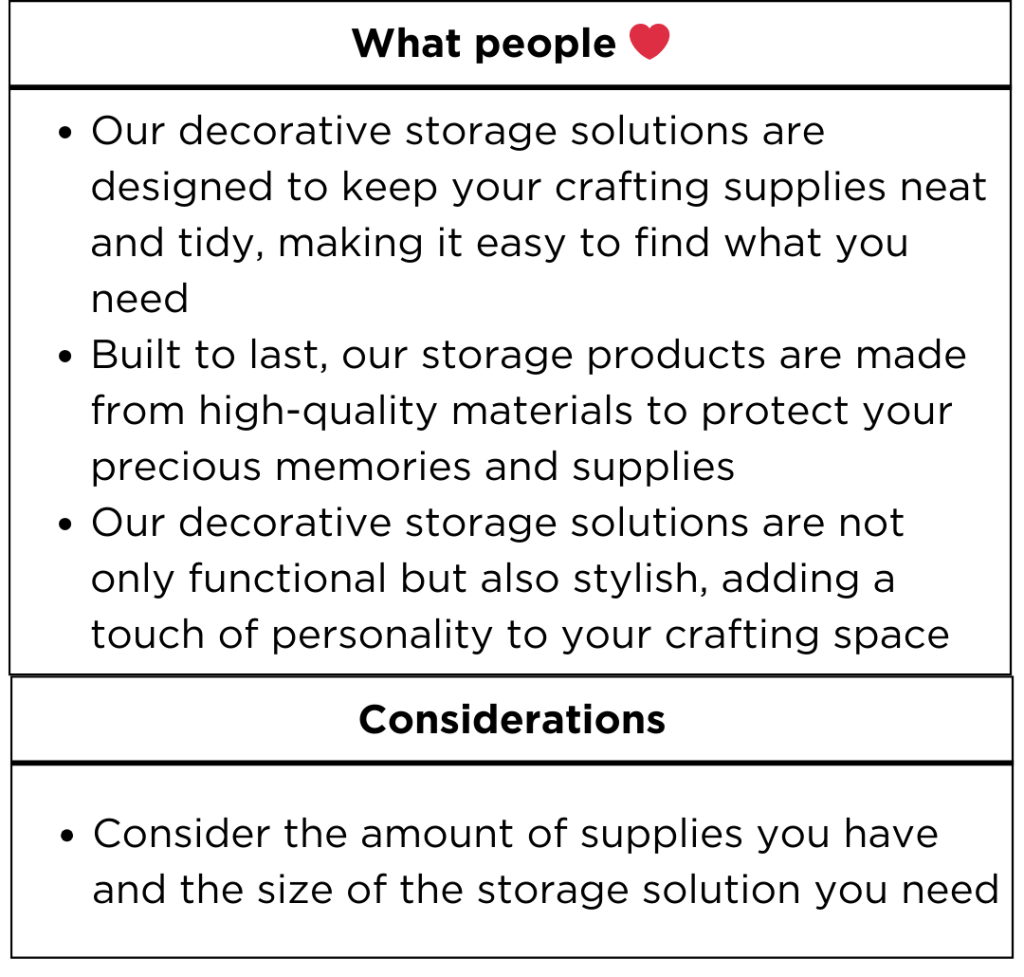Considerations: When choosing decorative storage solutions, consider the size and quantity of your supplies. We have options for all different collections and finding the right size will maximize your efficiency.