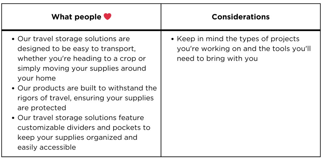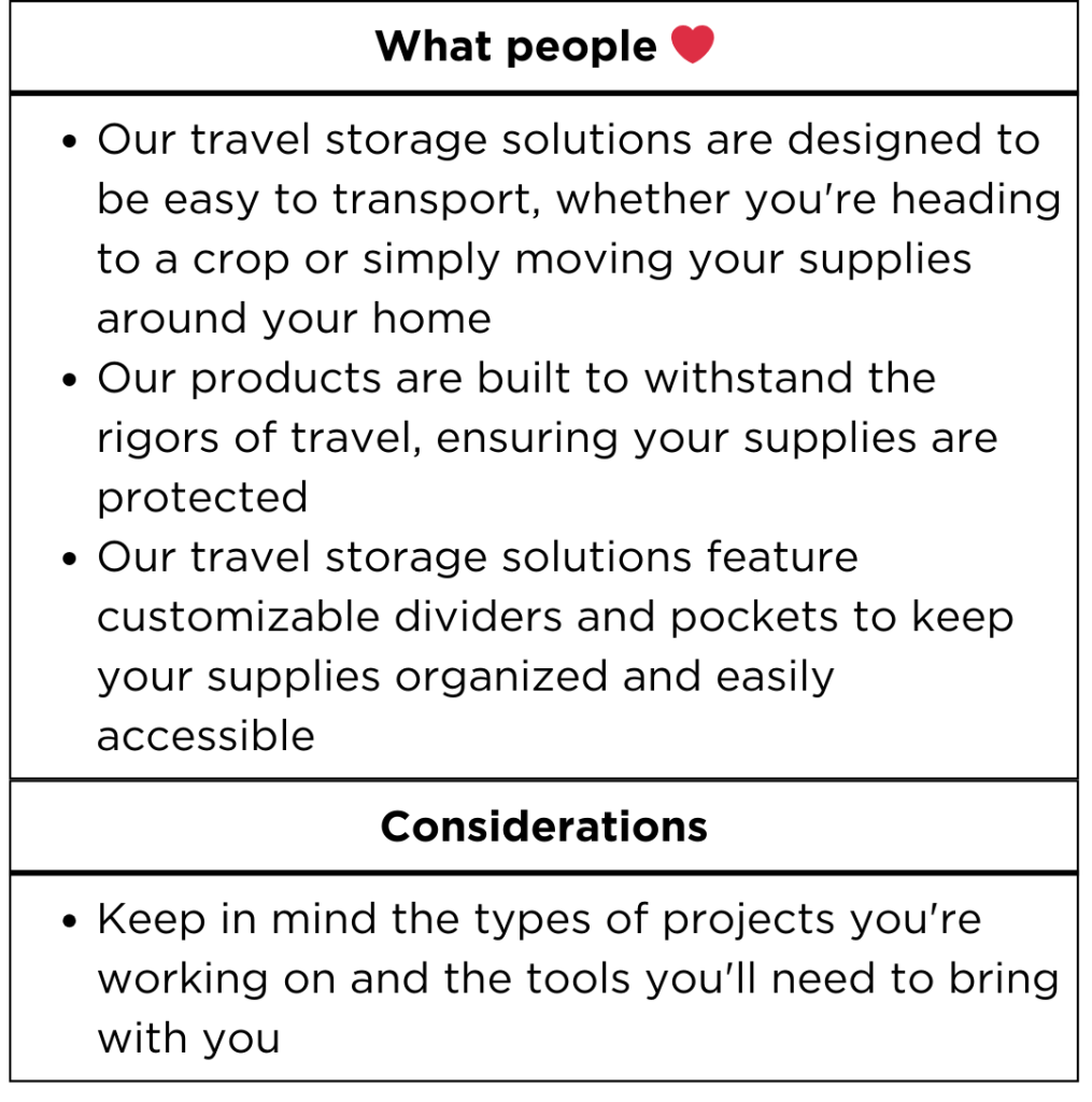 Considerations: When choosing a travel storage solution, consider the size and weight of your supplies. A larger tote may be more suitable for long-term storage or transporting a large number of supplies, while a smaller tote or organizer may be more convenient for shorter trips or specific projects. Additionally, think about the specific features that are important to you, such as a trolley sleeve, multiple compartments or a durable exterior.