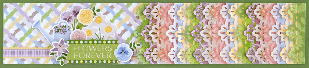 Step 4: Using the Floral Ribbon Border Punch, punch a border from the following papers: blue plaid, beige dots, pink scallops, yellow lines, purple petals and green floral. Cut each border into 2-5/8” segments. Adhere the first one along the edge of the diagonal plaid paper edge, then overlap the remaining segments from there. Adhere segments until you are at the end. Use a scissors to cut off any overhang.