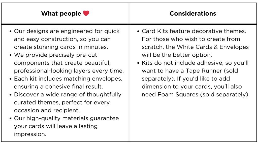 Considerations: Card Kits are designed to take the guesswork out of cardmaking, so if you prefer designing from scratch, you might prefer the White Cards & Envelopes to start with a blank canvas. Kits also do not include adhesive, so you’ll need to have a Tape Runner on hand. If you’d like to add dimension to your cards, you’ll also need Foam Squares (sold separately).