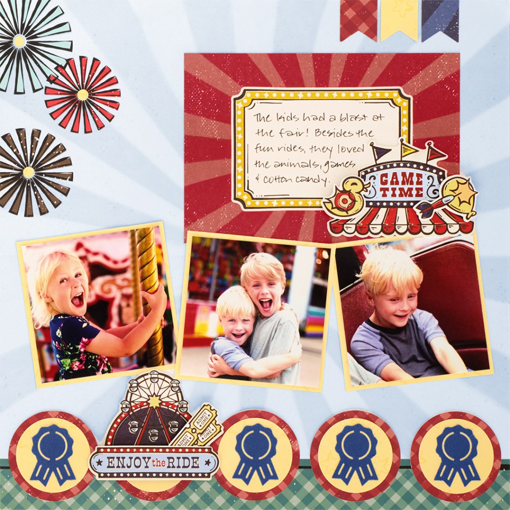 Step 2: Using the inside of the medium circle pattern and the Green Blade, cut five circles with a red checked mat card. Using the Circle Punch, punch five circles with yellow stars paper. Layer and adhere the circles on the green checked border at the bottom of the layout. Using the Award Ribbon Punch, punch four shapes with Blue Solid Cardstock. Adhere on four of the circles. Adhere the ferris wheel, tickets and “Enjoy the Ride” embellishments, popping the title up with Foam Squares.