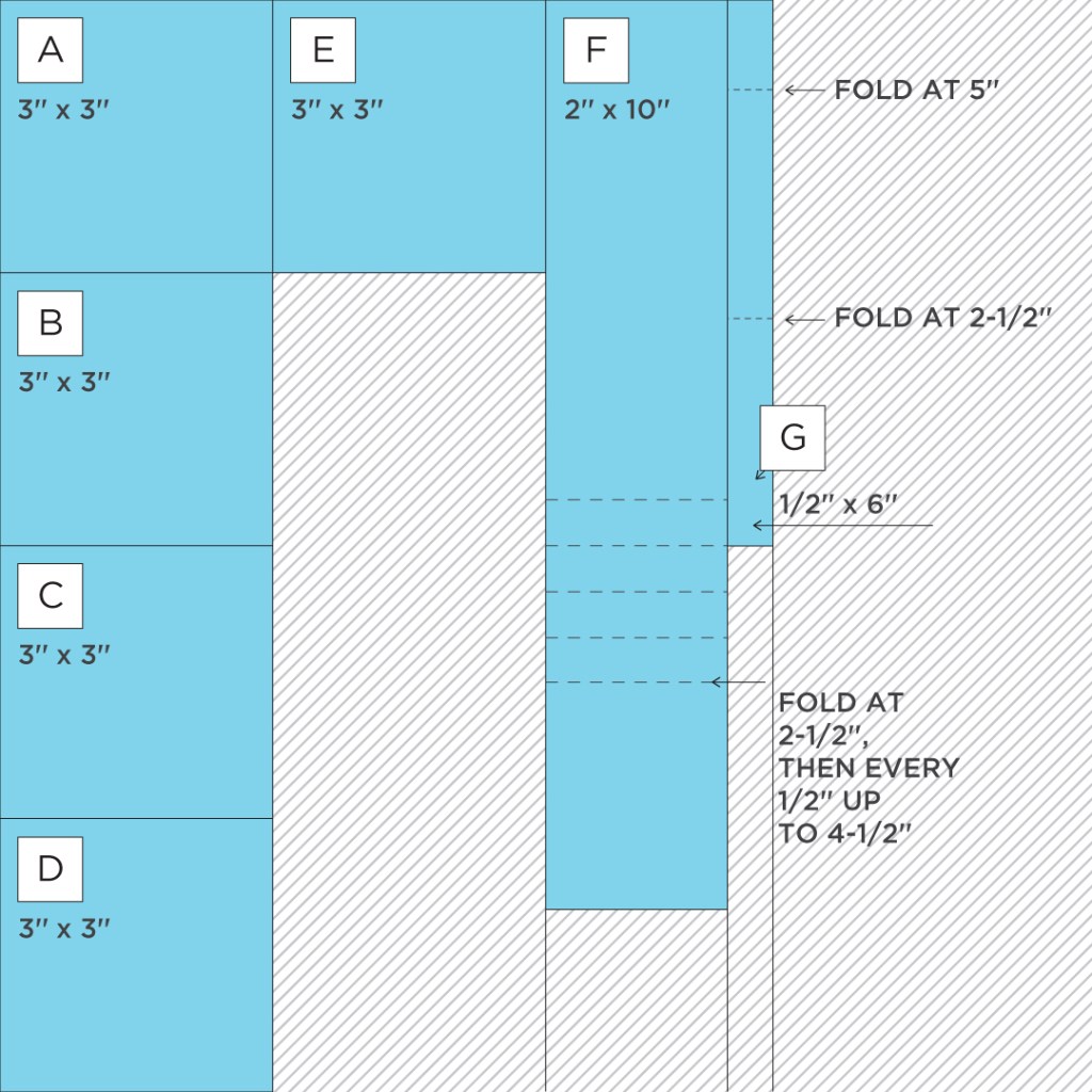 Step 2: Score piece F at 2-1/2″, 3″, 3-1/2″, 4″, and 4-1/2″ from one end. The 2-1/2″ segment will be the “bottom.” Fold score lines back and forth to give each fold some flex.