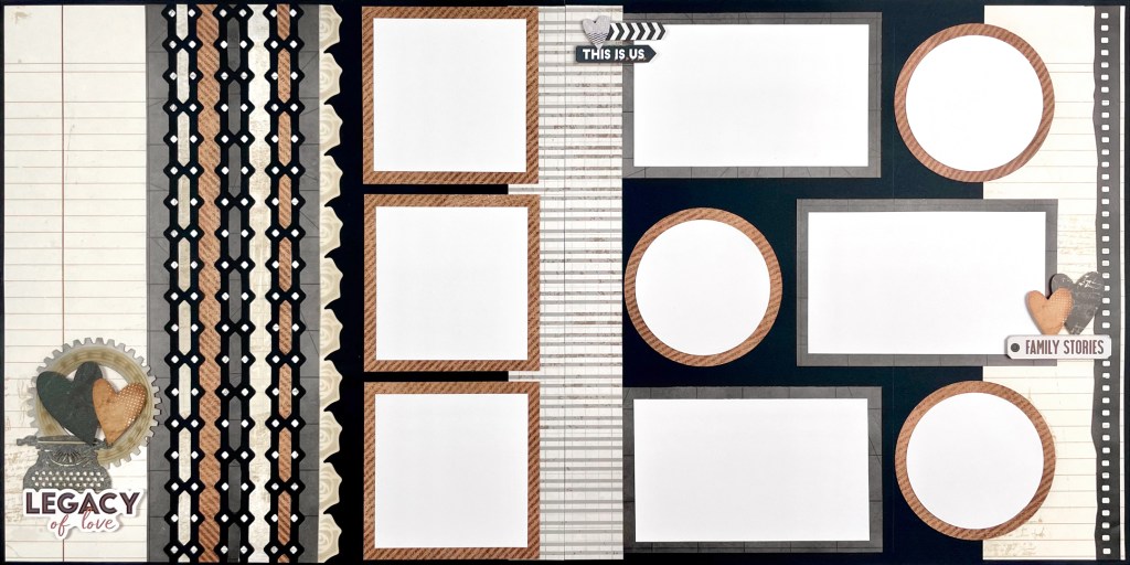 Now let’s talk about that border — this is where you can get creative. I used the Geometric Gems Chain BMC, but any chain-style design will work. Just punch three 11-3/4″ borders and cut four coordinating half-inch strips of paper. Then, weave the strips over and under the chain — it adds texture and movement without overwhelming the layout. I finished it with a die-cut border for a clean edge, but you could use a sticker or punch something fun to frame it in. And if you’re looking for a place to journal, lined paper (like the one from Legacy of Love) fits perfectly along the side. It’s such a satisfying layout once it all comes together!”