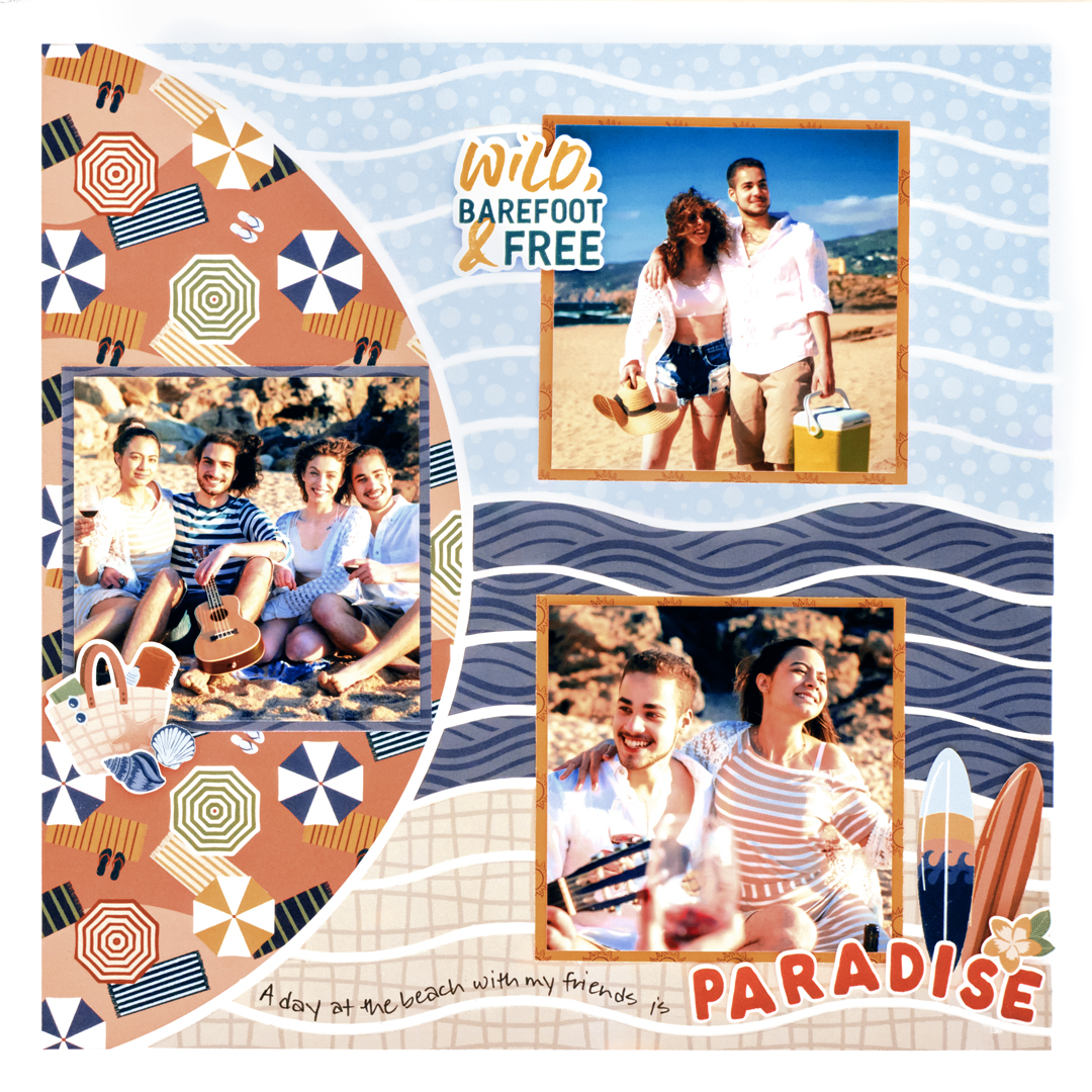This layout proves that a few creative cuts and coordinating papers can transport you straight to paradise. The combination of the Scenes Bundle, Recipe Template and playful stickers makes it fun to recreate this design — or put your own spin on it with your favorite destinations. So grab your beach photos, trace your shapes and get started… because the waves are calling, and your album is ready!
