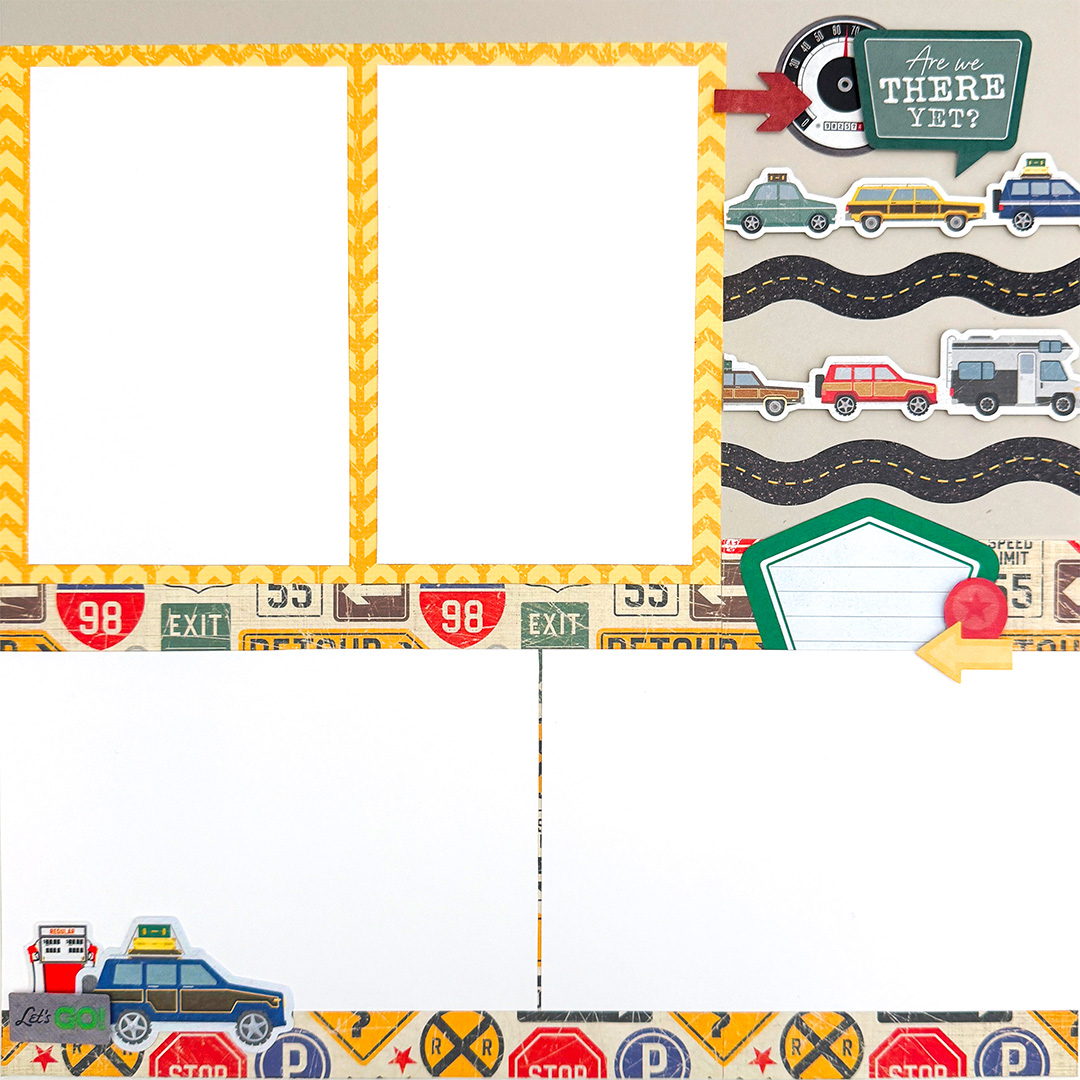 Noreen’s Tip: “When a sketch calls for borders, the sky is the limit! Here I cut two different sticker borders from the Hit the Road Stickers pack into 4” lengths and alternated them beside the photo block, but it would look great with borders punched with the Road Trip Border Punch too!”