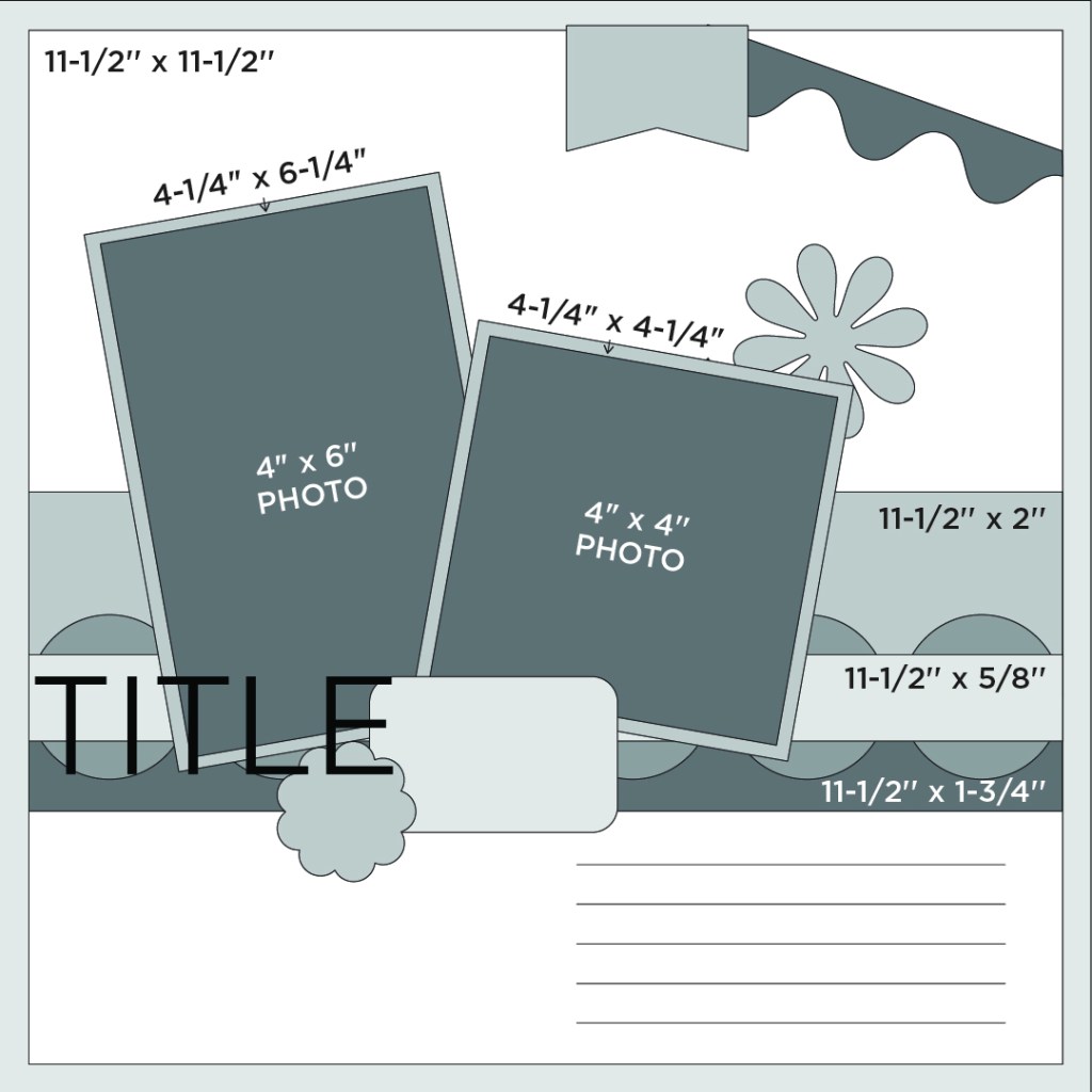 Kimberly’s Note: “I love the diagonal design in this sketch. Since it is a one-page layout, the embellishments beginning in the lower left and cascading into the upper right really provide excellent eye movement for the two focal photos in the center. Attaching them at a slight angle opposite from one another enhances that focal point.”