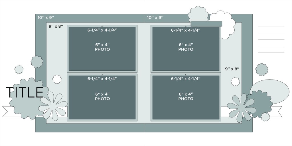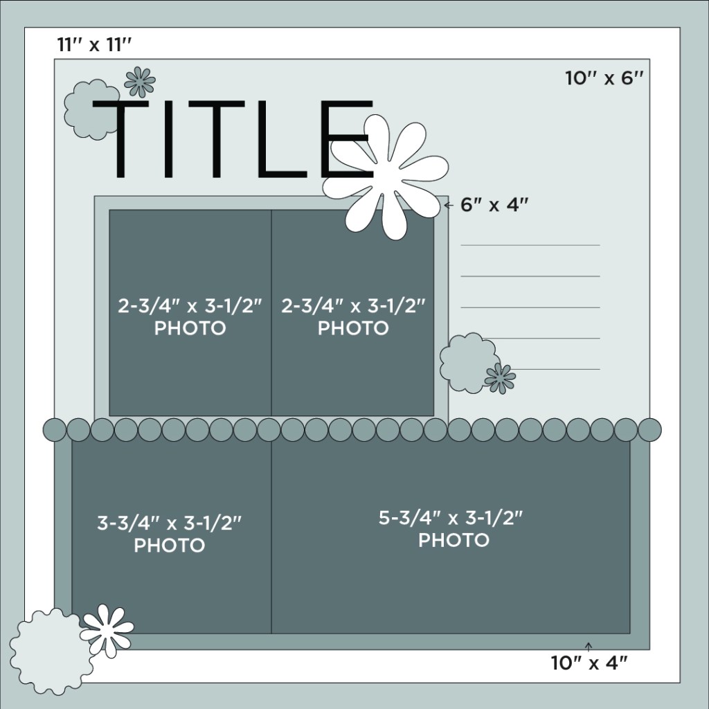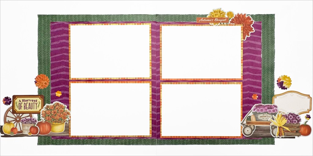 Noreen’s Note: “This sketch is a fantastic option for showcasing four photos on a single-page layout! With a mix of smaller and larger photo spots, it gives you flexibility to highlight focal images while still including supporting shots. Seasonal embellishments, like leaves and acorns, add extra charm while keeping the focus on the photos!